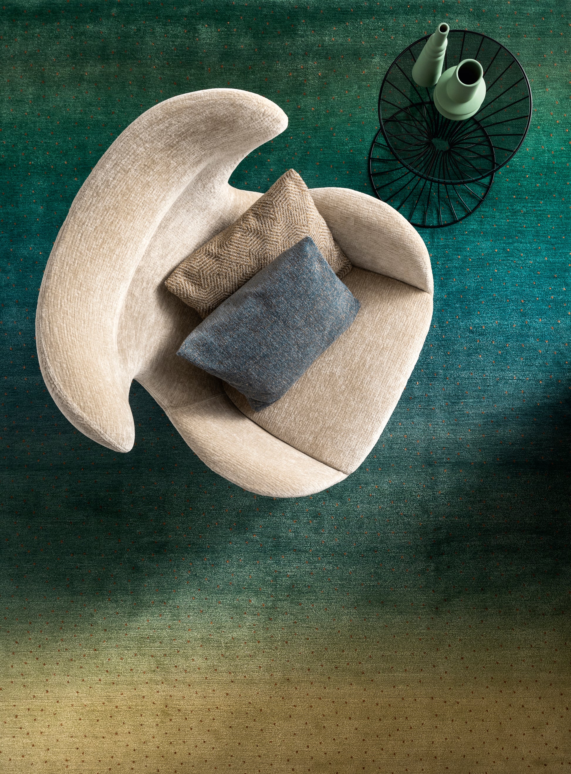 Die Blumenwiese ist ein Design, welches bereits vor Jahrhunderten in nomadischen Teppichen verwendet wurde. So gibt es noch Heute persische Gabbehs im traditionellen Design. Designercarpets Studio hat diese Arbeit mit einem aufwendigen Farbverlauf und innovativen Materialien neu interpretiert.